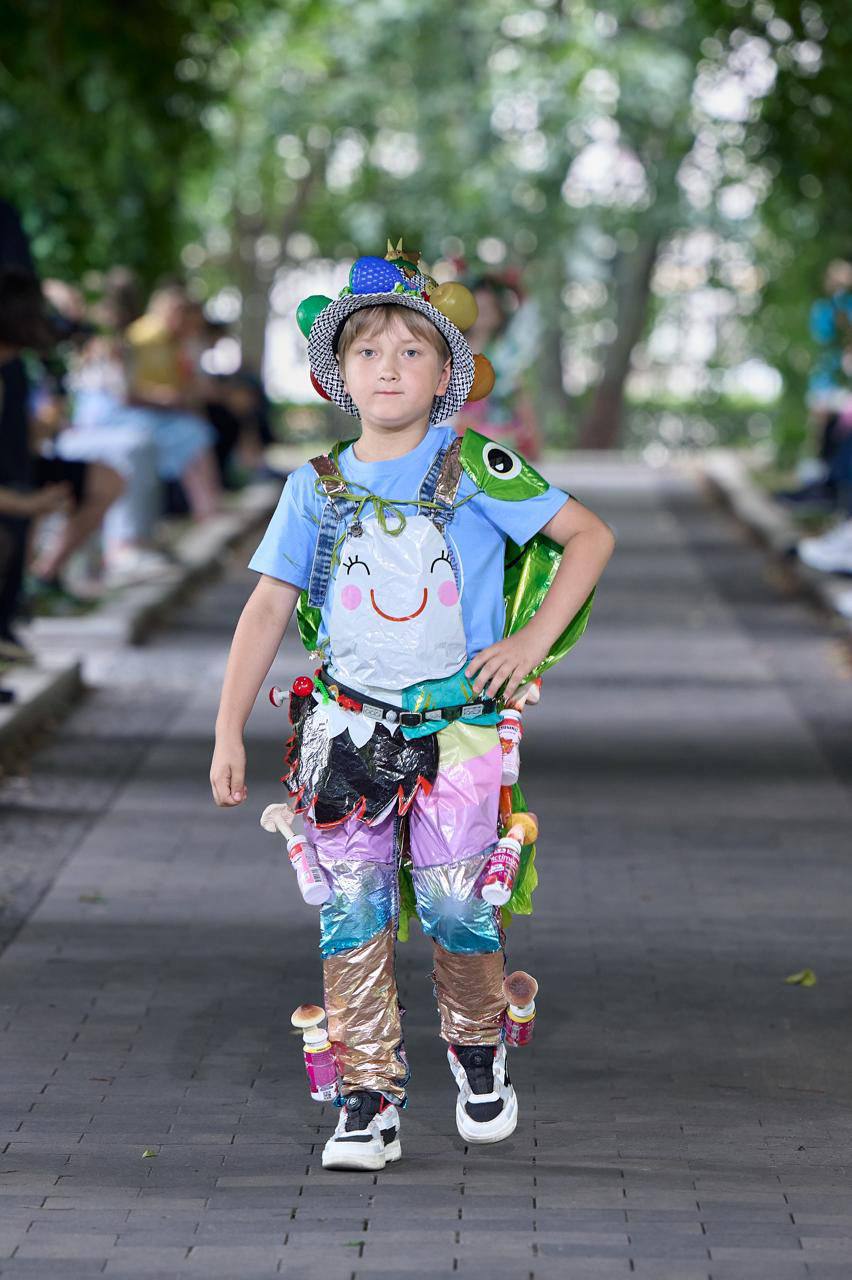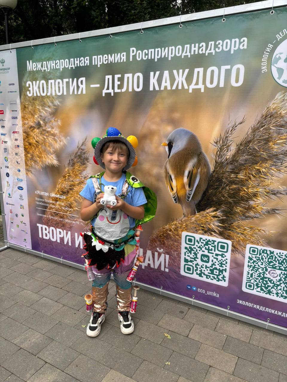 В фестивале дети и взрослые увидели, в том числе дизайнерский экопоказ с участием победителей и призеров V сезона премии Росприроднадзора «Экология - дело каждого». Ученик 3 «Д» Даниил З. представил свой костюм «Новый век», выполненный в технике апсайклинг - из старых фольгированных шаров, бутылочек от йогурта, коробочек от мороженого и ненужных игрушек.