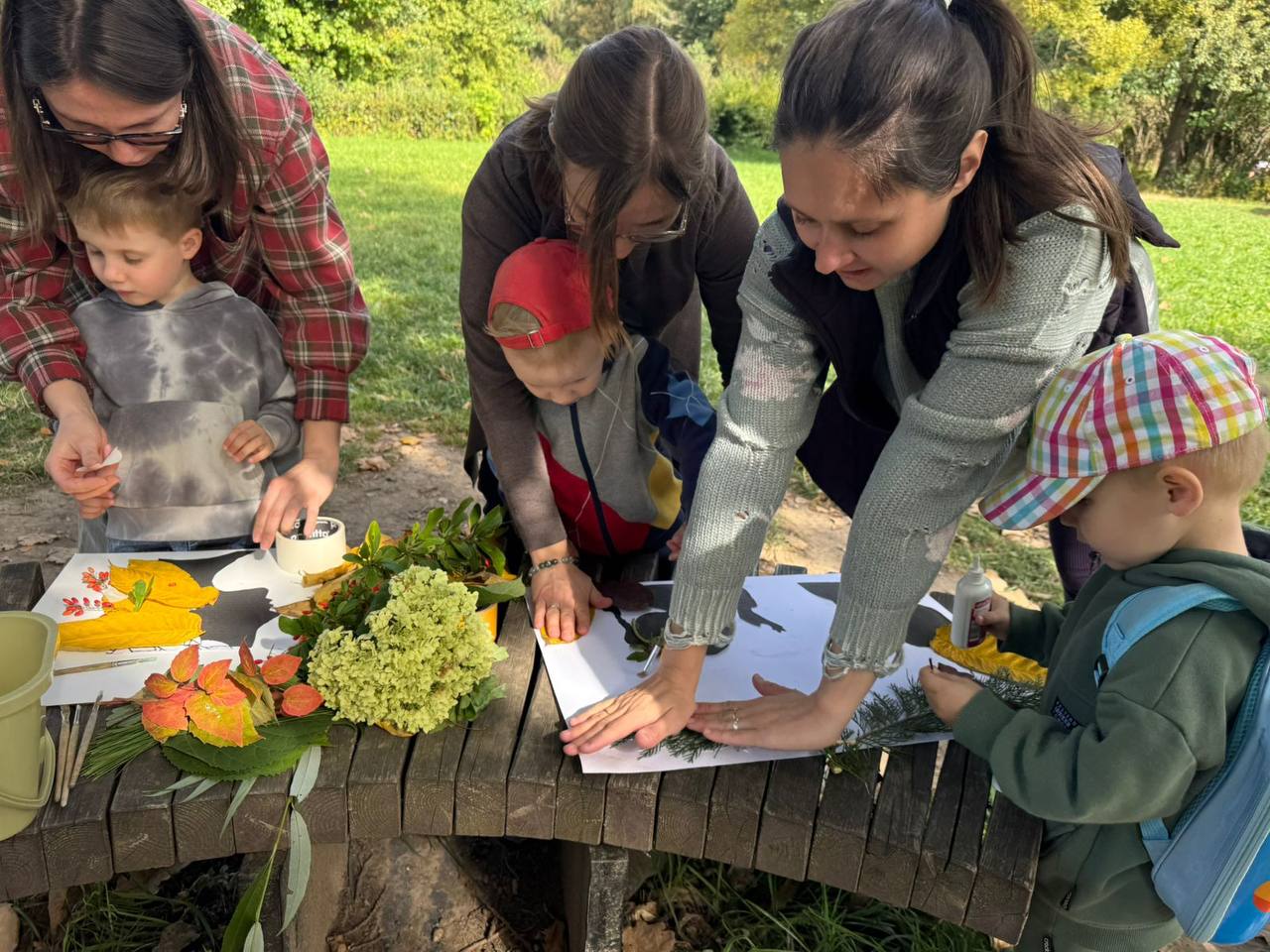Воспитатели Дарья Алексеевна Тучкова и Елена Юрьевна Коробская вместе с детьми и родителями отправились на замечательную прогулку по дендропарку. Собирали разные природные материалы: листья, шишки, веточки; любовались красотами вокруг и грелись под тёплым, жарким осенним солнцем.