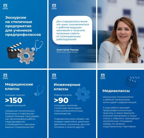 «Сегодня со столичными предпрофессиональными классами сотрудничают более 300 партнеров: ведущих ИТ-компаний, медиахолдингов, госкорпораций. Среди них — «Ростех», «Роскосмос», «Газпром-Медиа Холдинг» и другие. Они проводят мероприятия, которые помогают школьникам погрузиться в профессию, получить новые навыки и компетенции. В экскурсиях примут участие более 13 тысяч учеников инженерных, медицинских и медиаклассов», — рассказала заммэра Анастасия Ракова.