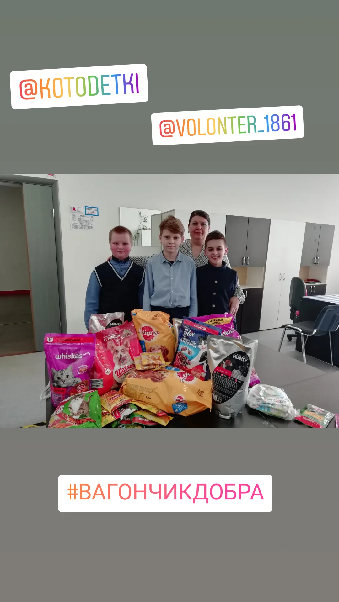 Большая благодарность администрации школы, а так же отдельно и лично Годововой Юлии Николаевне за проведение в нашем комплексе благотворительной акции " Вагончик добра". Равнодушие давно стало нашим спутником в 21 веке. Процитирую нашего классного руководителя Ольгу Валентивновну Стрюченко: "Воспитание у детей любви к животным- прекрасная школа воспитания доброты, сочувствия, чуткости. Проявляя заботу о животных, оказывая посильную помощь им, ребёнок чувствует себя более уверенным, сильным." Спасибо Юлии Николаевне, что дает нашим детям возможность быть не безразличными к людям и животным. Осознание, что маленькая помощь лучше чем ничего, делает нас добрее и ближе к друг другу.